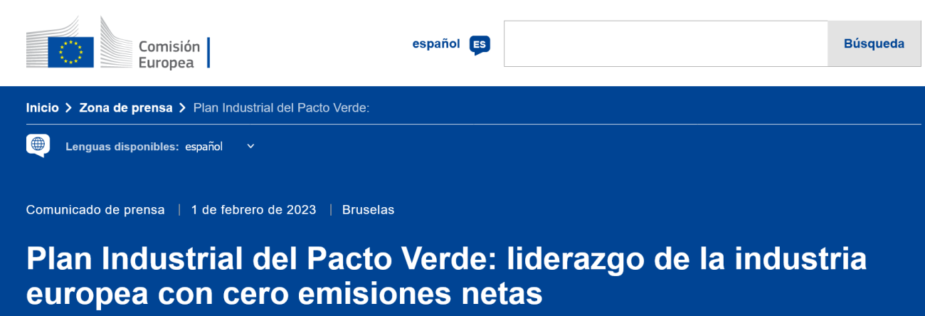 La Comisión Europea publica el Plan Industrial del Pacto Verde para la era Net Zero. Su objetivo es crear un entorno más propicio para el aumento de la capacidad de fabricación de la UE en relación con las tecnologías y productos con cero emisiones netas necesarios para cumplir los ambiciosos objetivos climáticos de Europa.