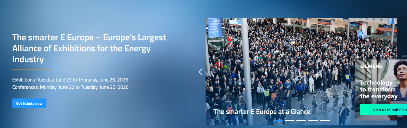 The smarter E Europe brings together the four exhibitions Intersolar Europe, ees Europe, Power2Drive Europe and EM-Power Europe. The exhibitions will take place from Tuesday, June 23 to Thursday, June 25, 2026, at Messe München.